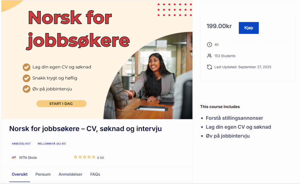 Kurset passer for alle jobbsøkere som har norsk på nivå A2–B1, og gir praktiske oppgaver, quiz og ekte eksempler fra norske stillingsannonser.